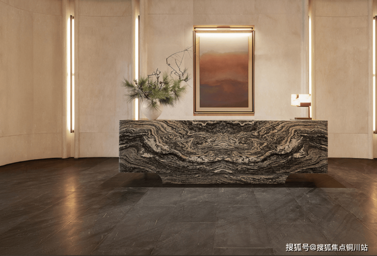 而这样的东方表达几乎是沉浸式存在,进入售楼处也是未来的会所空间,浣溪沙奢石打造的前台用石材天然纹理呼应《浣溪沙》