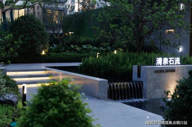 进入内庭空间,山涧流水跌瀑给予后场空间趣味与惬意。我们利用有限的场地,营造不同的高差变化,高耸的飞瀑流水,层层的清泉叠水,清脆悦耳。水景花池采用古铜色不锈钢边带,池底采用黑金沙黑花岗岩,且做了不同于前场水景的整黑系处理,整体形成几何肌理的视觉延伸。