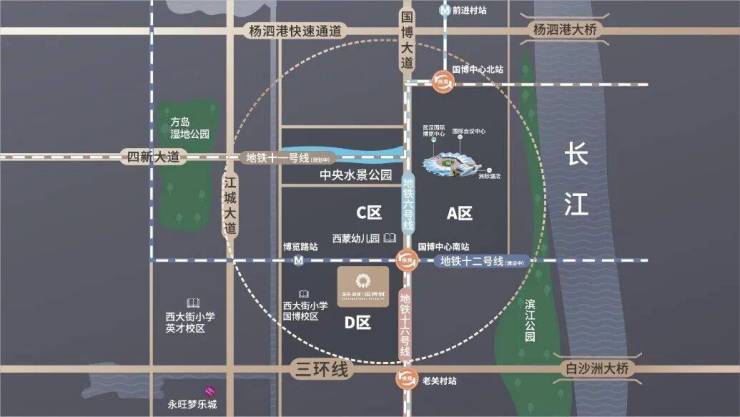 【自带公立幼儿园,外享一站式教育资源】D12地块本身自带一所公立幼儿园,一路之隔西大街小学国博校区(汉阳第一梯队小学)、国博高中,周边更有西蒙国际幼儿园、楚萌幼儿园、武汉三中、武汉第三寄宿中学(与项目相隔不到1公里)等名校环绕,实现全龄段家门口式教育,护航孩子未来成长,更赋予城市新生力量。