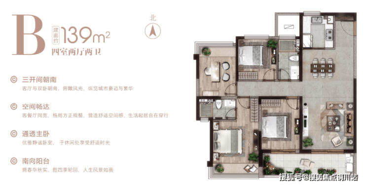 建面约139㎡:餐客厅一条化,与南向大阳台相连;朝北次卧270°转角飘窗;主卧套房,而且是南向独卫。