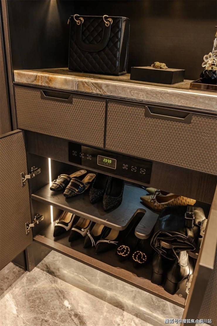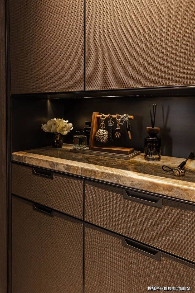 玄关处设独立收纳系统,在满足储物功能的同时,实现了与全屋风格的协调统一,细腻的皮革纹理,让收纳也成为了一种艺术。柜内安装鞋柜精灵,实现除味、杀菌、除湿,保持柜内环境时刻清新干爽。