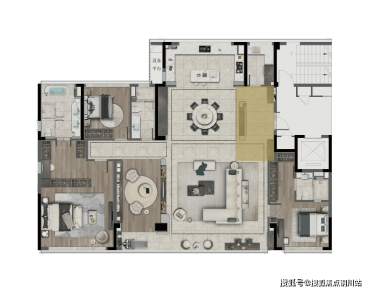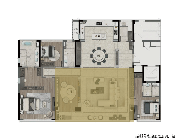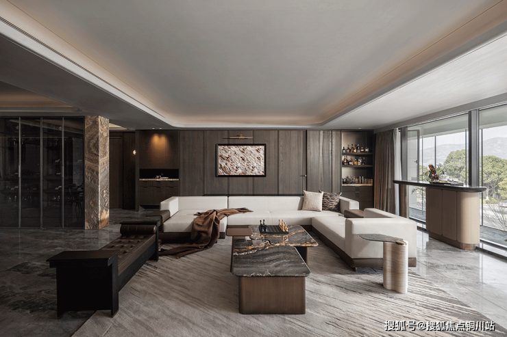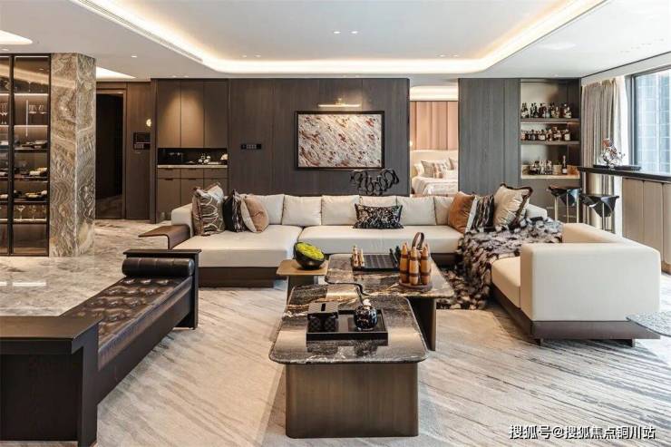 LDKB行政通厅,建面约80㎡阔绰空间,南向约20m超大面宽,构建社交与生活的双重舞台。通过对整个空间的布局分割,保持整体性的同时,区隔出不同的功能区域,最终呈现出高度和谐统一、极具品味的大宅属性。