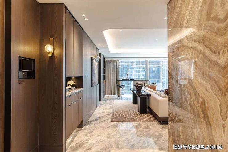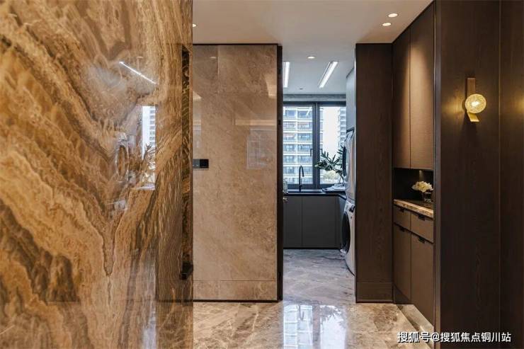 步入玄关,一幅水墨奢石画卷便徐徐展开,简洁而不失丰富的纹理细腻流淌,于无声中奠定空间的奢雅基调。归家双动线设计,清晰划分生活场域,一条动线由玄关进入客厅,迎宾待客;一条动线串联家政区与餐厨空间,回归生活。