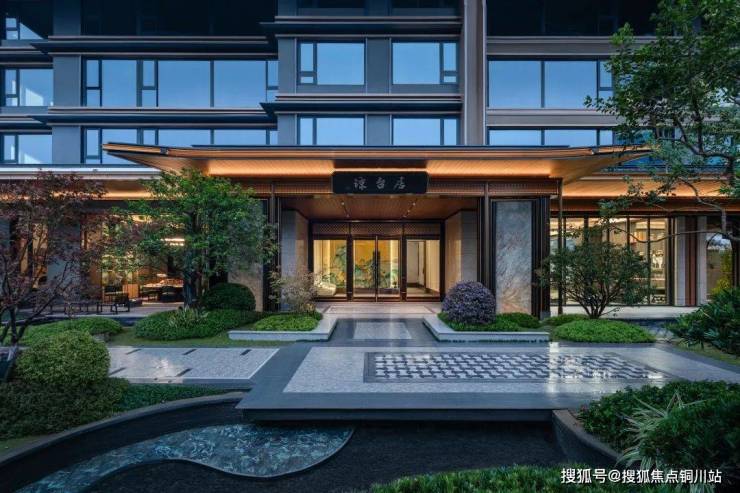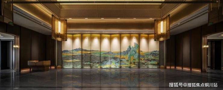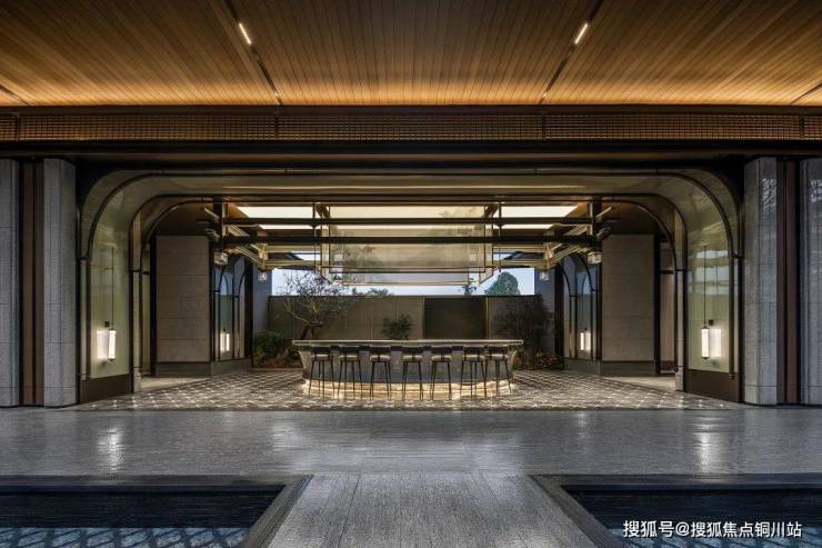 建发的项目往往从门看起,经典的三重挑檐顶部造型、镇宅瑞兽麒麟、对植罗汉松、正中的巨幅《千里江山图》,由画入境。
