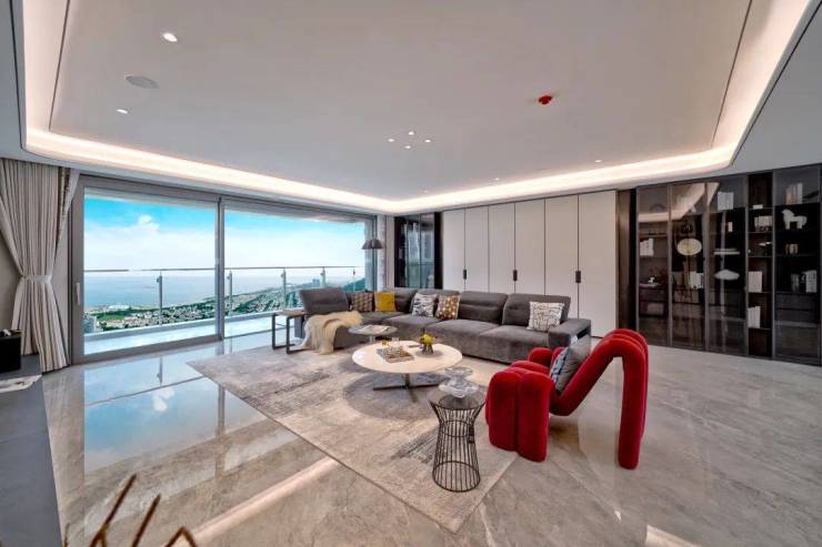 玻璃幕墙的运用,营造通透感是其一,其二是拥景入室。配合高窗墙比,珺府最大限度地将山海景致纳入居家视野中,一扇窗就是一幅醉人的山海画卷。客厅、卧室甚至厨房,居者可以从不同角度领略浮山的苍翠巍峨、石老人的碧波霞光,或是远眺的放空,这是银丰从设计角度为生活创造的留白,亦借此将珍稀的山海资源价值进一步放大。
