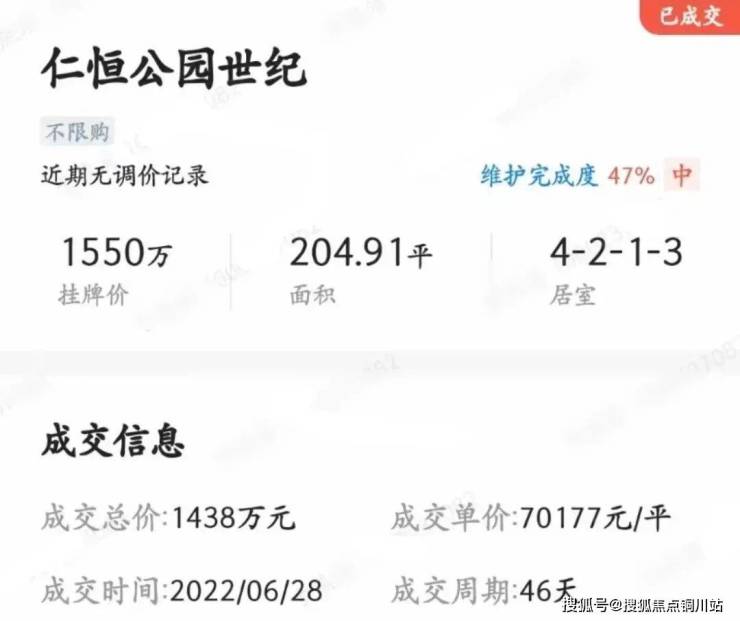小区建面约204㎡叠墅,二手成交总价1438万,创下70177元/㎡的成交单价纪录,成交周期仅46天。交付不到两年,成交单价上涨近2.5万/㎡!