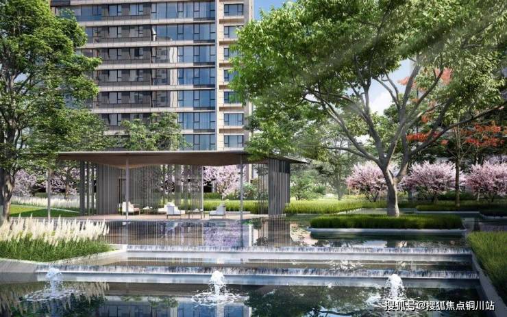 以层叠水景打造高差台地,搭配涌泉点缀,辅以绿植景观、林下休闲、森养庭院等,尽享流转游园之趣。