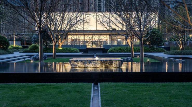 中央聚场结合美国建筑大师路易斯康落日广场的设计语言,四水归堂,水流静邃,8棵榉树矩阵,以中西式结合的设计手法,既显大气,更显格调。