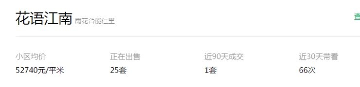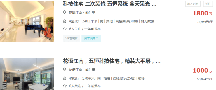 作为花语系南京代表作,花语江南是五恒科技系统,品质出众,目前挂牌均价高达近5.3万元/㎡,在楼市下行期,二手房成交价一直稳定在4万+,前期最高卖到了4.5万元/㎡。