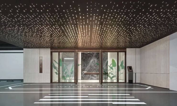 以灰色为主调的前行车道,简约大气;驶入内外过渡的中车马厅落客区,顶部金咖铝板定制切割的星空顶以万千盏繁星光彩配合细腻的灯光渲染,营造出星河璀璨的归家体验,这种自上而下的流动质感,让身心在视觉盛宴中都沉静下来。