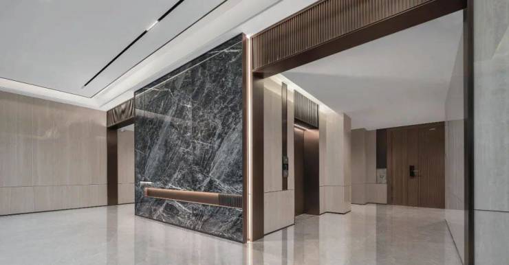 地下光厅是地下归家动线上最后也是相当重要的一环,暖灰与浅灰的主色系将高级感拿捏得恰到好处,大面岩板、大尺度仿石砖与金属线条的高阶材质与细节打磨,呈现星级酒店的奢华质感。