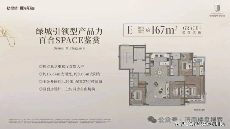 167㎡三/四室:私享电梯厅;约15.4米面宽,约8.05米阳台;主卧开间约4.29米,270度拐角窗;双套房。