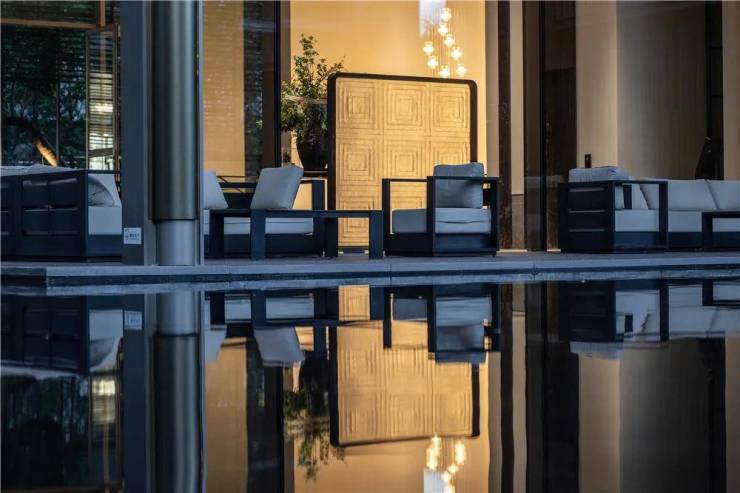 定制细节:大堂内用瑞符拼接的石材地砖、故宫老师傅手工壁画、软装灯具、大堂外的龙鳞墙、电梯厅门,以及随处可见的门把手、园林的路灯与监控的集成杆、定制的地漏、石材排水槽等,哪怕是户内的开关面板也都是定制。