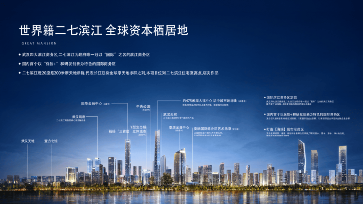 大型商业综合体武汉天地、壹方南馆、壹方北馆,构筑全业态商业系统,平安金融中心、环球智慧中心、武汉企业天地1号等近20家世界500强、60余家外资及合资企业,强势铸就二七滨江价值高地。