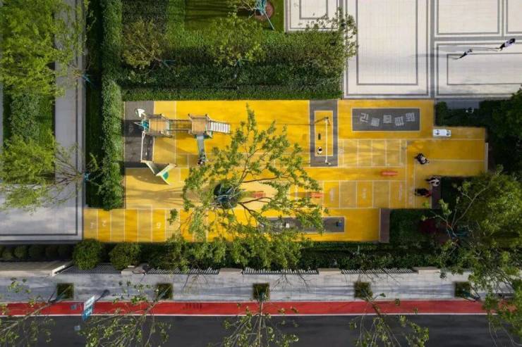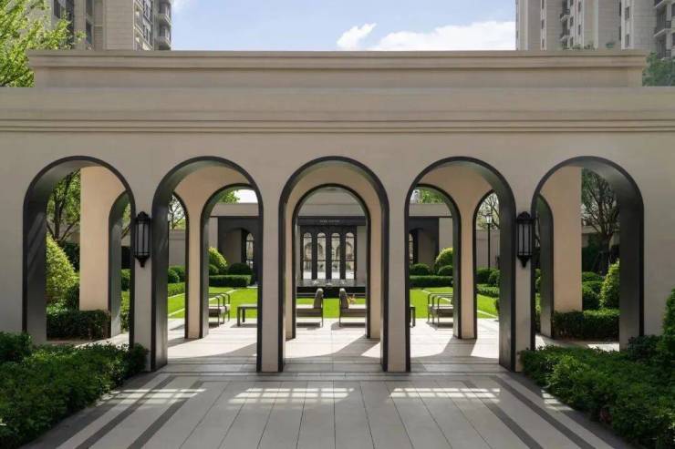 挺拔的榉树、规整的灌木、几何风石材铺装……犹如进入韦斯安德森的电影世界,随手一拍,都是大片。