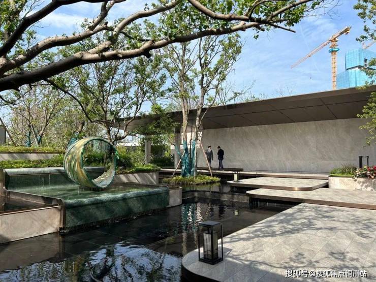 “鎏光谧境”美学示范区,巧妙利用场地高差,规划设置三境叠水庭院空间,临城市界面铺陈拥抱式“华门贵阙“,石材与金属飞檐端庄大气;珠帘水幕与层层叠水相辉映,寓意红星鎏金生意场上的生机活力与财富源泉。