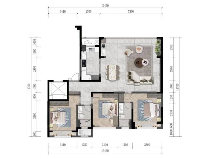 北面空中花园、客餐厅融为一体,形成近48平大横厅。同时,南面面宽约13.46米,规划三个卧室绰绰有余,最小的卧室面宽都有约3.1米的舒适尺度,主、次卧面宽则达到约3.4、3.5米。
