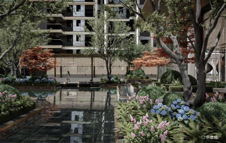 西派澜廷通过风雨连廊将架空层与六大风格各异的园林景观相互串联,结合水景、景观种植池、码头休憩场景,形成多维度立体景观体验空间。
