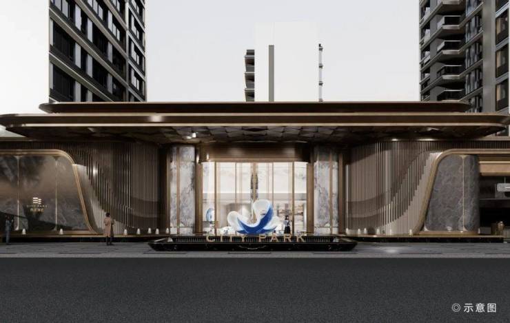 社区入户大门即小区的“门面担当”。西派澜廷的入户大门,门头宽约40米、高约8米,大门墙面材质采用大面积高奢灰石材,辅以香槟色铝板,门楼顶细节纹样以市花茶花为灵感,并配上高端酒店式门头水景,打造臻奢山水自然雅居。