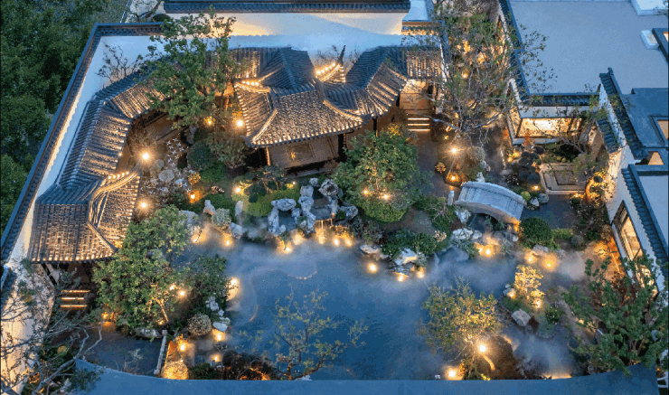 园林萃取古建美学,融入马头墙、砖雕等元素