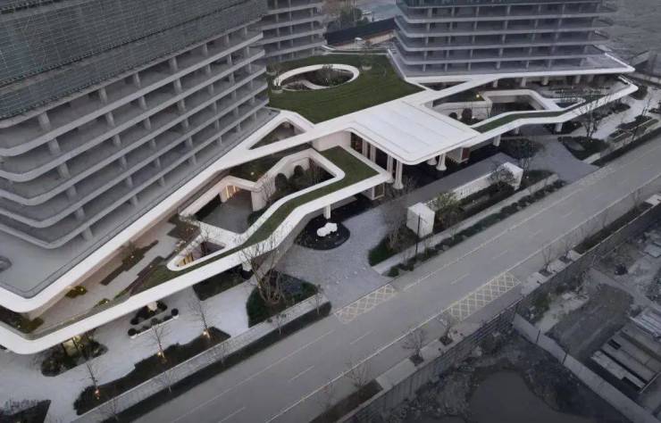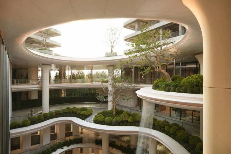 从上往下看,4层叠水空间景观,3级站台落客系统,双会所体系,宛如新加坡樟宜国际机场,潺潺的流水从天而降,一幅满怀自然生机的立体森境呈现在我们眼前,成为驻留、漫步、欣赏的生活新地标。