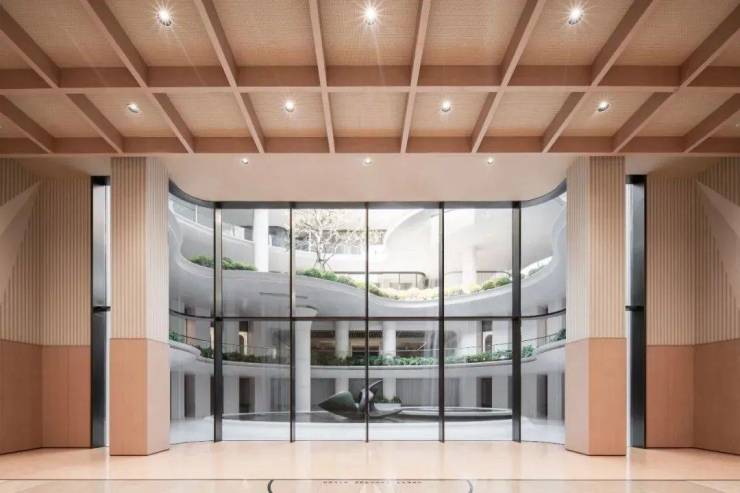 穿过门庭,迎面而来的是一片开阔的中庭空间,设计灵感源自于长江的波澜壮阔,以流动的线条和简洁的几何形状,勾勒出一幅现代与自然和谐共存的画卷。