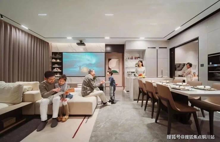 比如通过“开放式厨房+宽景公区”一体化设计,形成约50㎡共享空间,妈妈在厨房做晚餐,爸爸在餐厅收拾,爷爷在客厅看电视都在视野之中,成为了全家人情感交流的核心枢纽,堪称“全能社交场”。