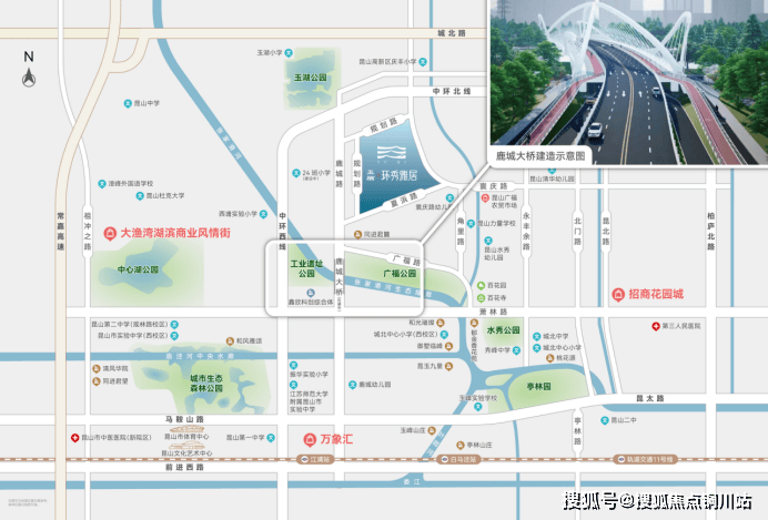 项目踞昆山高新区核芯,鹿城路北延直通中环高架。项目与万象汇、招商花园城、森林公园、体育中心及周边邻里商业,构筑 10 分钟繁华生活圈