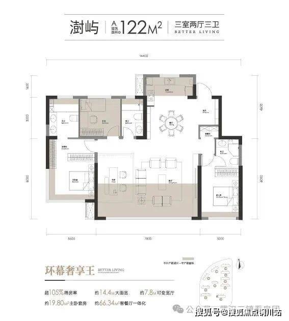 122㎡三房两厅三卫:约14.4米面宽、约7.8米大横厅、双套房设计