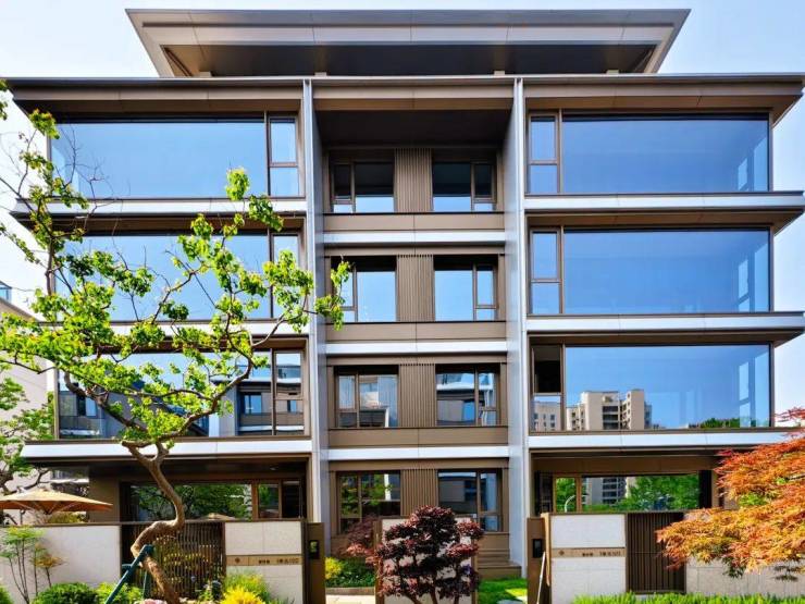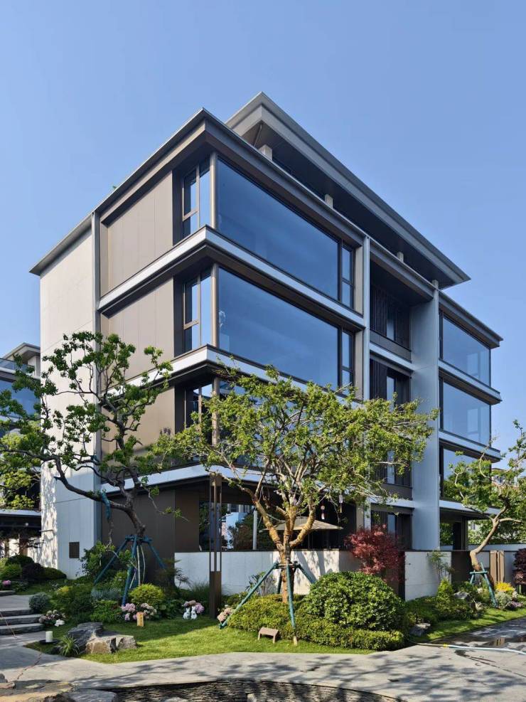 整个外立面采用石材、大面积玻璃和大尺寸的厚铝板组成,符合更多追求高颜值建筑的客群审美。