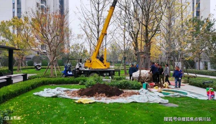 栽种时的场景更显匠心:吊车悬停半空,师傅们反复调试着树木的角度,从枝蔓伸展方向到与景墙的呼应关系,甚至模拟业主归家动线上的观赏视角。这种"锱铢必较"的执着,让每一棵树都找到了最诗意的落脚点。