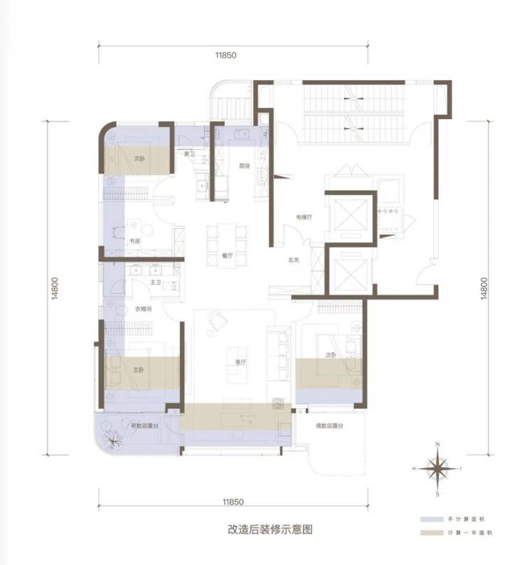 以高层173㎡为例,南北露台,露台宽度2.9米-3米,奇数偶数的差别在于连通的卧室不同,没有涉及客厅露台。