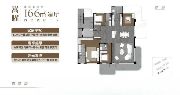 洋房户型166㎡,也分端厅,中厅。端厅拐角露台+阳台,偶数露台覆盖客厅+南侧次卧,奇数层覆盖餐厅以及北向卧室。,中厅就是南北向露台+阳台。