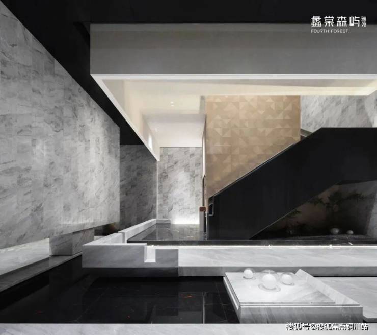 在实景呈现的全维示范区中,约80m宽、9m高的 纯白拱门采用白玉兰天然石材进行了几何体块的构筑,城市喧器在此悄然退场,唯留一场尊崇序章。