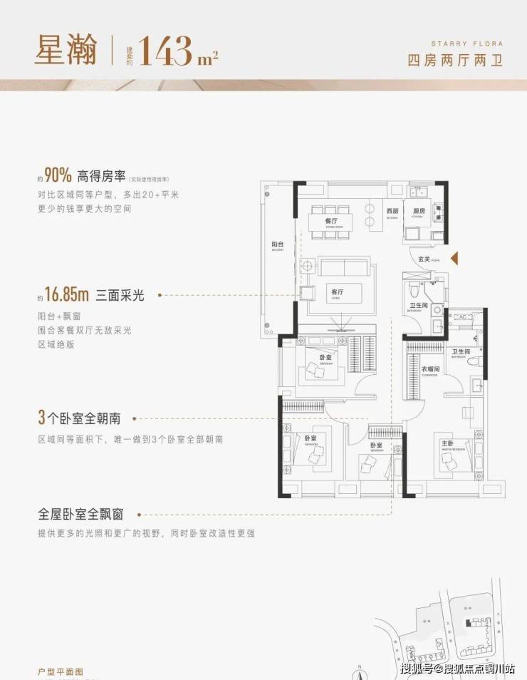 143㎡的高奢四房中,270°会客厅、中西双厨设计,酒店式主卧套房等可同时拥有,居住体验媲美大平层。