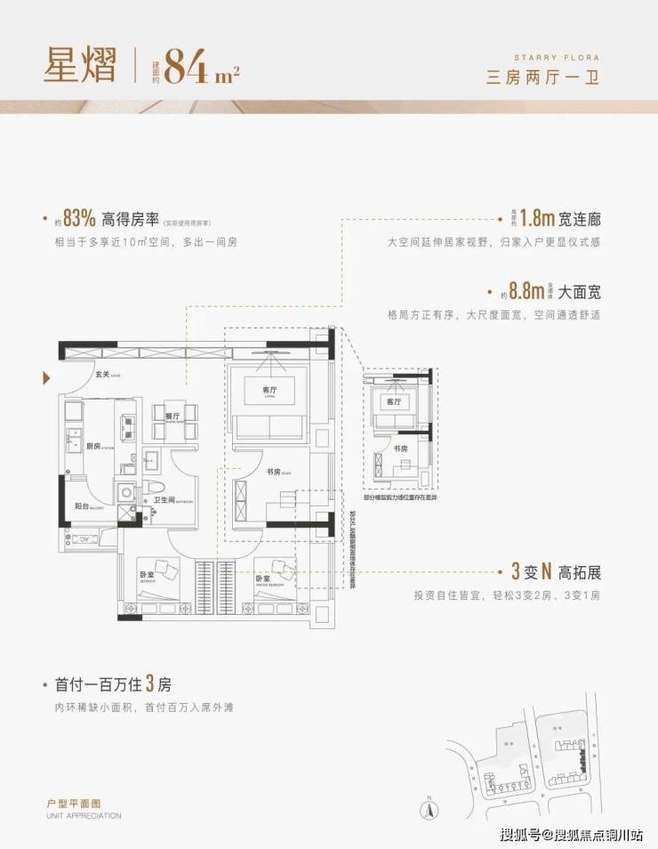 84㎡可随意切换为1/2/3房,还能拥有大横厅。128㎡还可以4房变3房,拥有豪宅同款大套房。