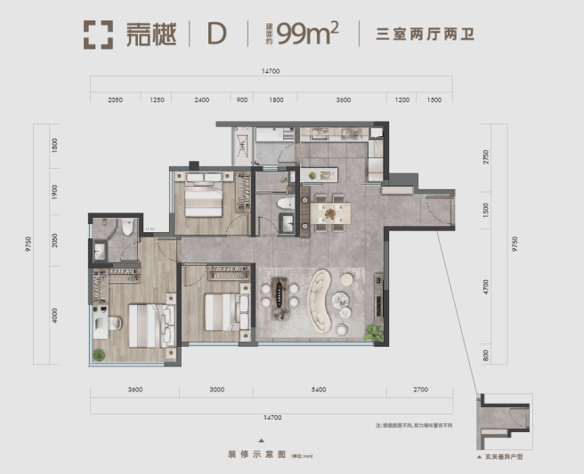 高得房率:得益于房产新规的下发,联发|观音桥·嘉樾的得房率实现了对上一代旧规产品的超越 —— 建面88㎡的三房两卫户型,实际使用面积约83㎡;建面99㎡的三房两卫户型,实际使用面积约96㎡。相比于普遍得房率只有80%-85%的次新二手房、旧规新房,嘉樾的实际使用率突破了95%,无异于对房价打了“折上折”。