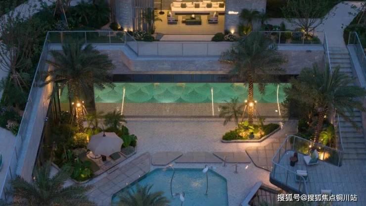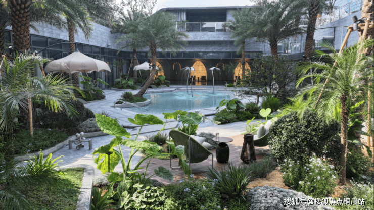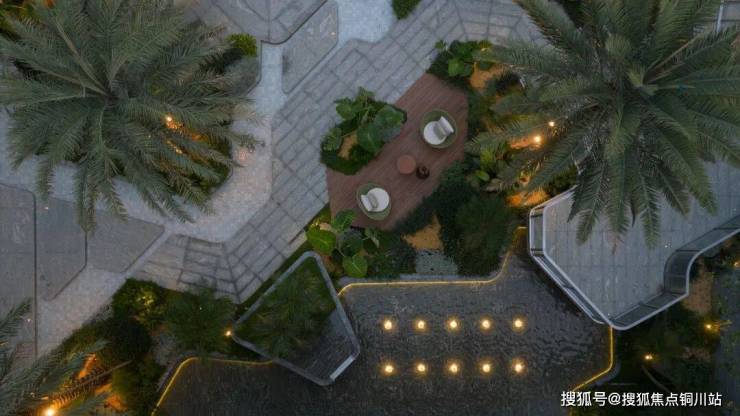 迎龙观月下沉式私屿庭院约800㎡,是整个项目景观的核心,也是海岛风情的集中体现。以“漂浮绿洲”为灵感,构筑 “滨水游憩景观体系”,打破传统景观平面感,以最大竖向落差约3米的地形,结合多层次植被与水景,塑造出丰富立体的热带景观序列。