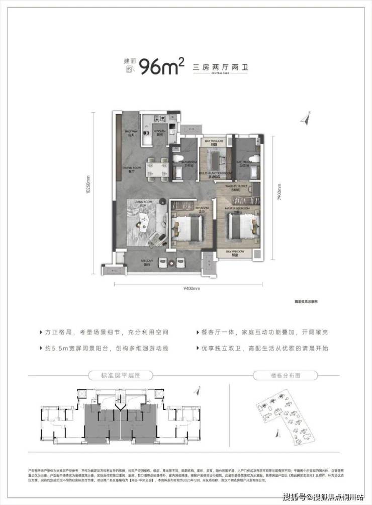 建面约96㎡三房两卫,布局非常方正,三开间朝南,南向带一个约5.5米开间的双阳台,非常实用,96平做三房的有,但是能做到三房两卫的,只能说明一个问题,公摊面积超低!