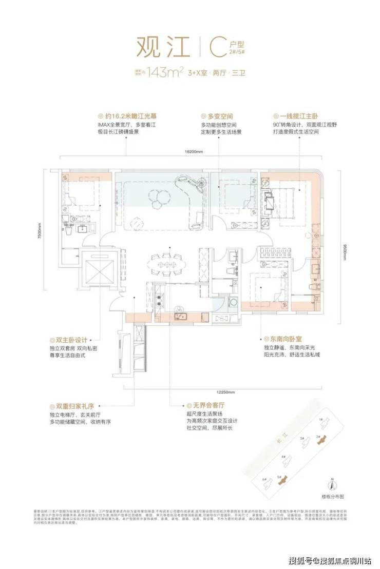 建面约143㎡户型面宽罕见做到了约16.2米,形成IMAX巨幕观江面。