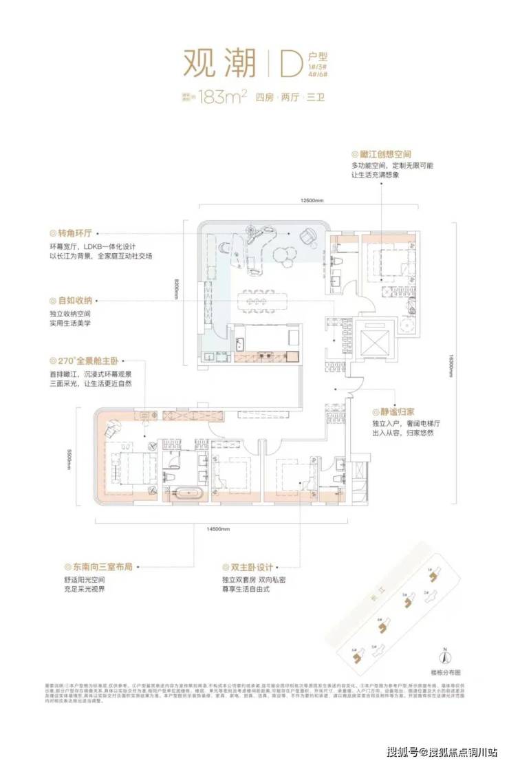 整个项目,每户住宅层高做到3.05米,每户沿江面均配置全景落地LOW-E玻璃幕墙,实现约7.4—9米的看江横厅、全景舱270度无界观江体验。