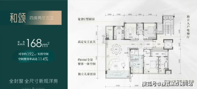建筑面积约168㎡:实得面积约192㎡,实际得房率114%,相当于旧规226㎡。(旧规户型按85%得房率计算,仅供参考)