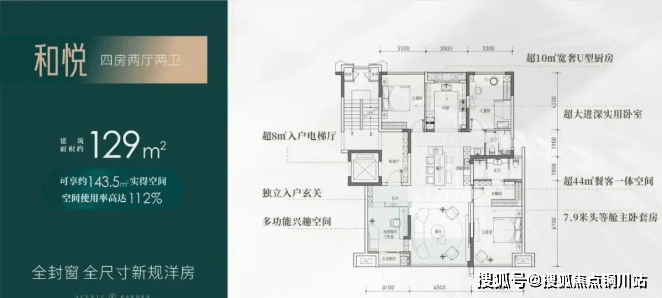 建筑面积约129㎡:实得面积约143.5㎡,实际得房率112%,相当于旧规169㎡。(旧规户型按85%得房率计算,仅供参考)