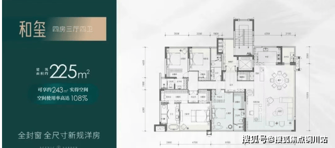 建筑面积约225㎡:实得面积约243㎡,实际得房率108%,相当于旧规286㎡。(旧规户型按85%得房率计算,仅供参考)