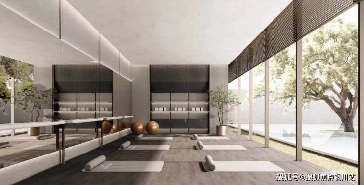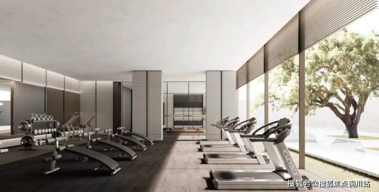 会客厅内部设置下沉式庭院,建筑与景观完美融合,通透的区隔设计使得健身之余也能欣赏到室外美景。
