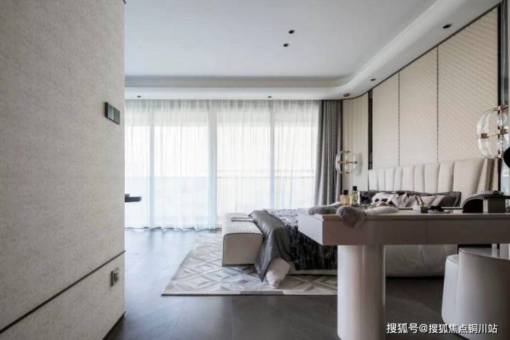 二层主卧套房,奢享约42㎡的室内空间。精致衣帽间搭配梳妆台,构成女主人的专属小天地;大面的落地窗,将室内的视野进行极致放大,推窗见景,让居者每天都在院中美景的召唤中醒来。