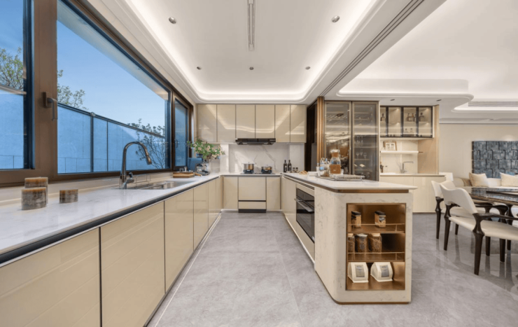 奢侈选材:巴西进口烤漆玻璃门板色泽温润,抗污易洁;影木饰面与迈巴赫同款,将顶级豪车的设计语言融入家居;三大奢石台面纹理独一无二,成为空间中无可复制的艺术焦点。