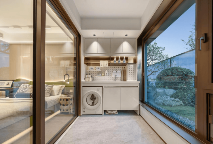 独立家政阳台预留洗衣机、烘干机等家电位、配备大型储物柜,容纳吸尘器、工具箱与各类日用品囤货,让杂乱后勤井然有序。