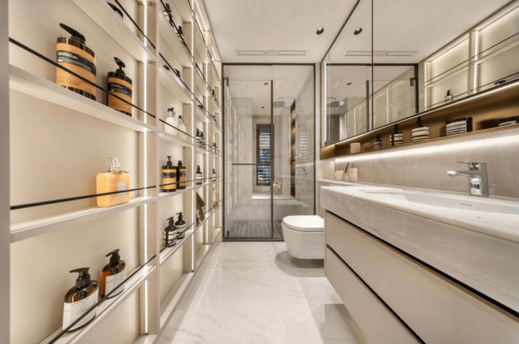 利用镜柜、台盆柜与壁龛,细化至化妆品、吹风机、卫生纸与清洁用品的干湿分储,处处井然有序。