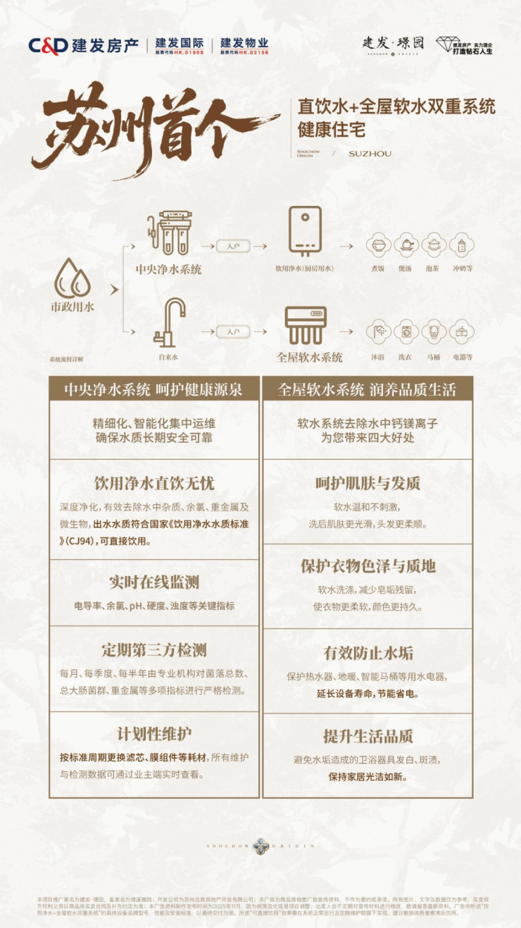 在舒适三件套:新风(松下)、地暖(菲斯曼)、中央空调(大金)成为高端标配的当下,建发璟园更进一步,增设中央净水与全屋软水双重黑科技健康水系统,实现从基础舒适到健康呵护的全面升级。